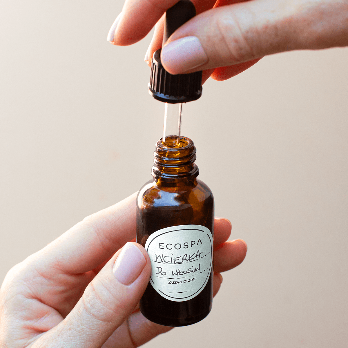 Dwufazową wcierkę do włosów wypadających z olejem z aronii, Wcierkę pobudzającą włosy do wzrostu z olejami: z czarnego kminku, rokitnikowym i lnianym oraz z olejkiem lawendowym i rozmarynowym, a także Wcierkę do skóry głowy z ekstraktem CO2 z oregano stosuje się przed myciem głowy, w następujący sposób: