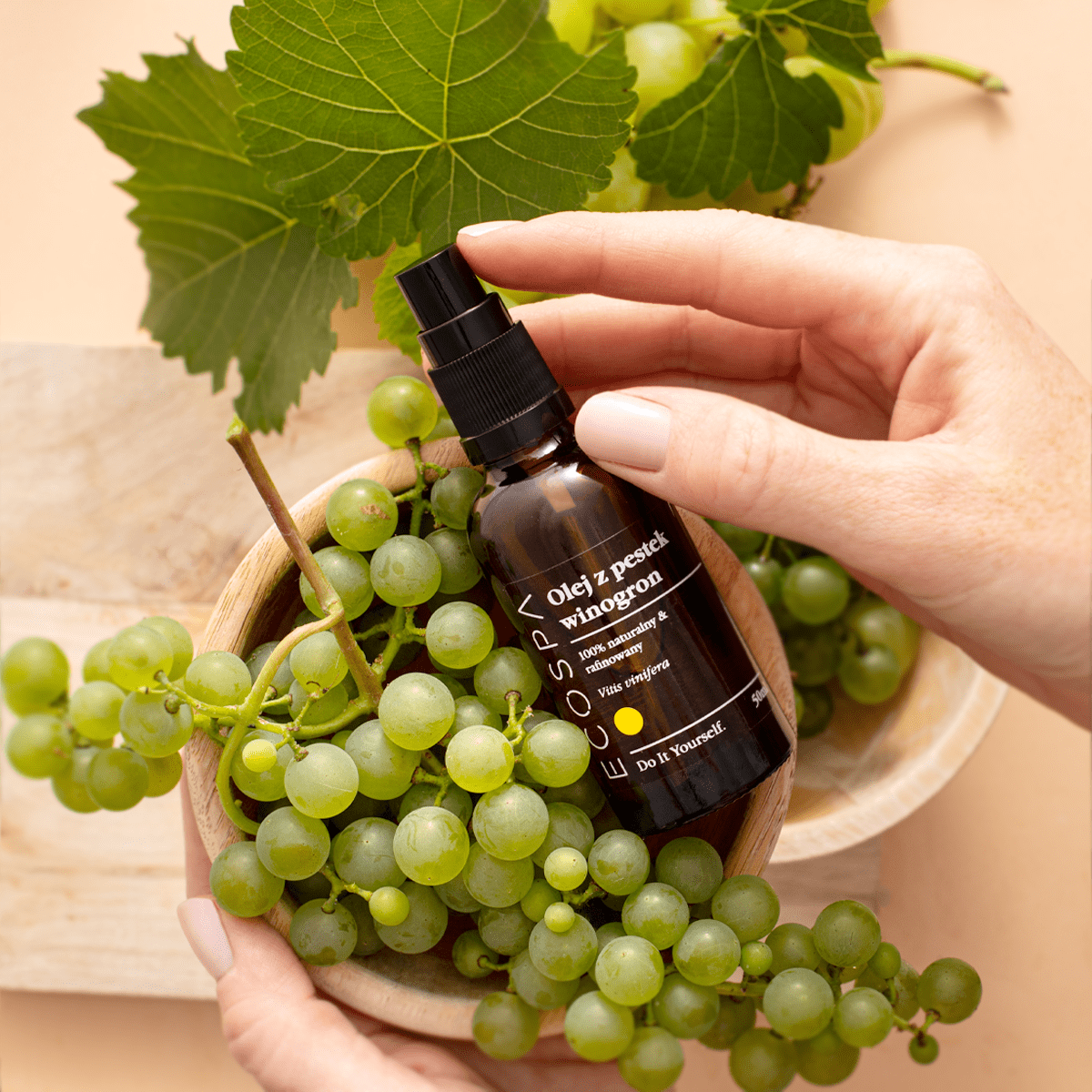 Olej z pestek winogron świetnie sprawdza się stosowany zarówno na twarz, jak i na ciało. Wykorzystuje się go w pielęgnacji skóry dojrzałej, suchej i mało elastycznej. Nie tylko zwiększa produkcję kolagenu i elastyny, ale także intensywnie nawilża i napina skórę, odżywia ją, wygładza zmarszczki i zapobiega powstawaniu nowych. Warto też wiedzieć, że olej z pestek winogron wzmacnia naczynia krwionośne, dlatego poprawia stan skóry z teleangiektazjami.